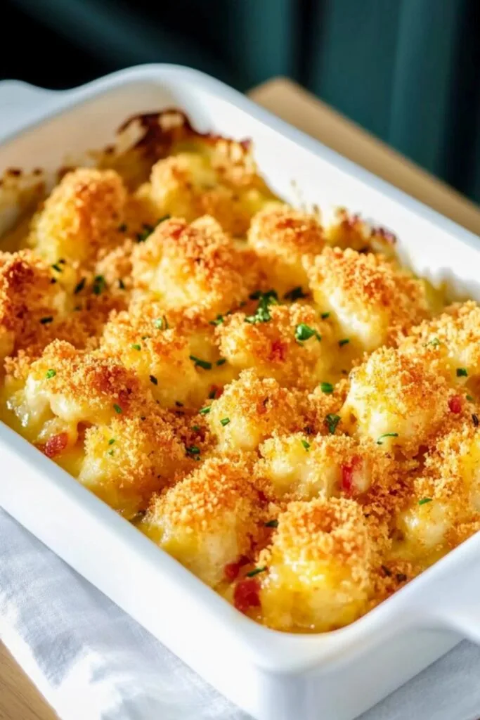 - Spoon the cauliflower mixture into the prepared baking dish, spreading it out evenly. Sprinkle the remaining shredded cheese over the top.Melt the remaining 2 tablespoons of butter in a small bowl and mix it with the breadcrumbs until evenly coated. Scatter the buttery breadcrumbs over the casserole.