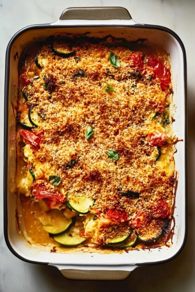 - In a small bowl, combine the panko breadcrumbs, dried oregano, garlic powder, and the remaining 2 tablespoons of Parmesan cheese.Sprinkle ¼ cup of the breadcrumb mixture evenly over the bottom of the baking dish.Arrange half the zucchini slices in a slightly overlapping layer over the breadcrumbs.Add half the tomato slices in a layer over the zucchini.Sprinkle half of the cheese mixture over the tomato layer.Repeat the layering process: zucchini, tomatoes, and the remaining cheese mixture.Finish by sprinkling the rest of the breadcrumb mixture evenly over the top.