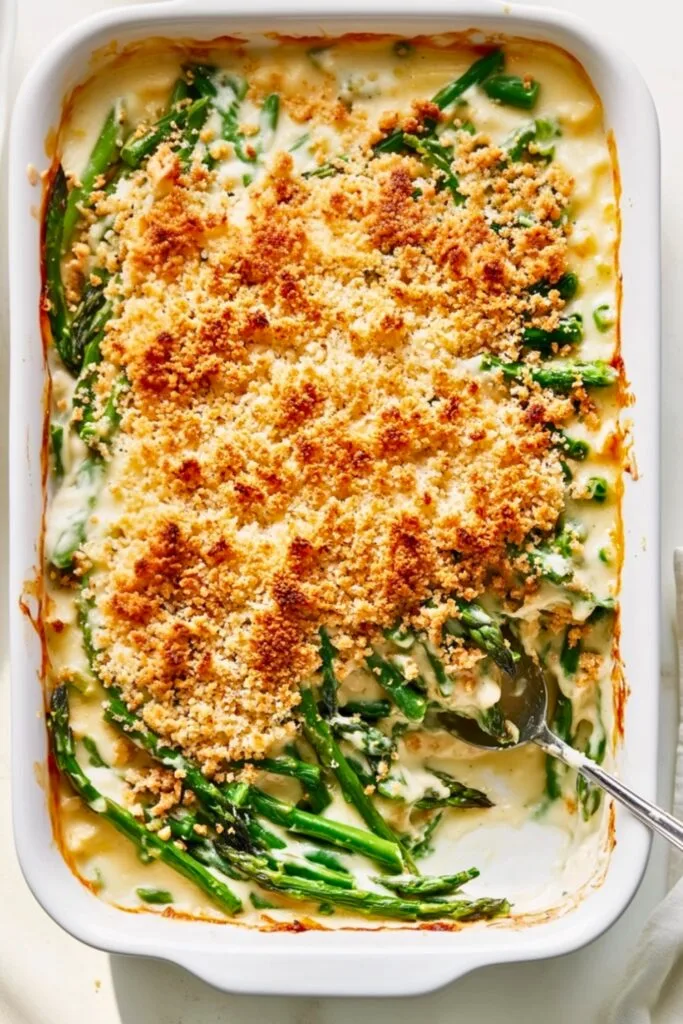 - Pour the cheese sauce over the asparagus and gently stir to coat everything evenly. Sprinkle the buttered panko breadcrumbs over the top.Bake in the preheated oven for 12-15 minutes, or until the casserole is bubbling and the topping is golden brown.