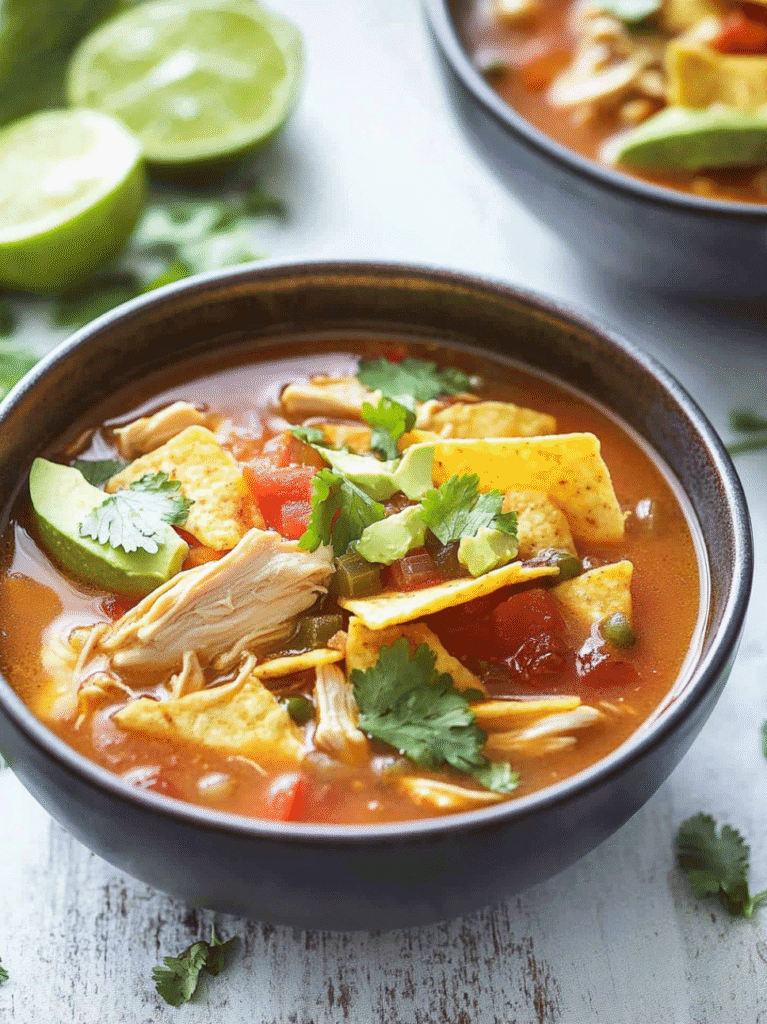This Chicken Tortilla Soup is a comforting and flavorful meal that you can whip up in no time. Using ingredients from your pantry and leftovers, such as cooked chicken, this soup is perfect for a quick and satisfying dinner.