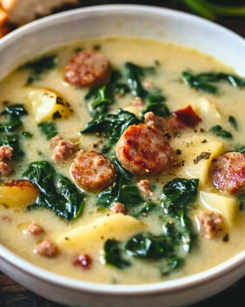 With hearty chunks of sausage, crispy bacon, tender potatoes, and fresh spinach all simmered in a rich, creamy broth, it’s the ultimate comfort food that’s sure to warm you up on even the coldest days.