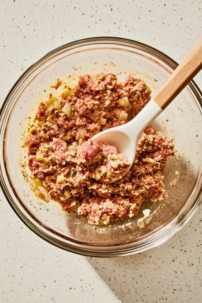 - In a large mixing bowl, gently combine the ground beef and ground pork.