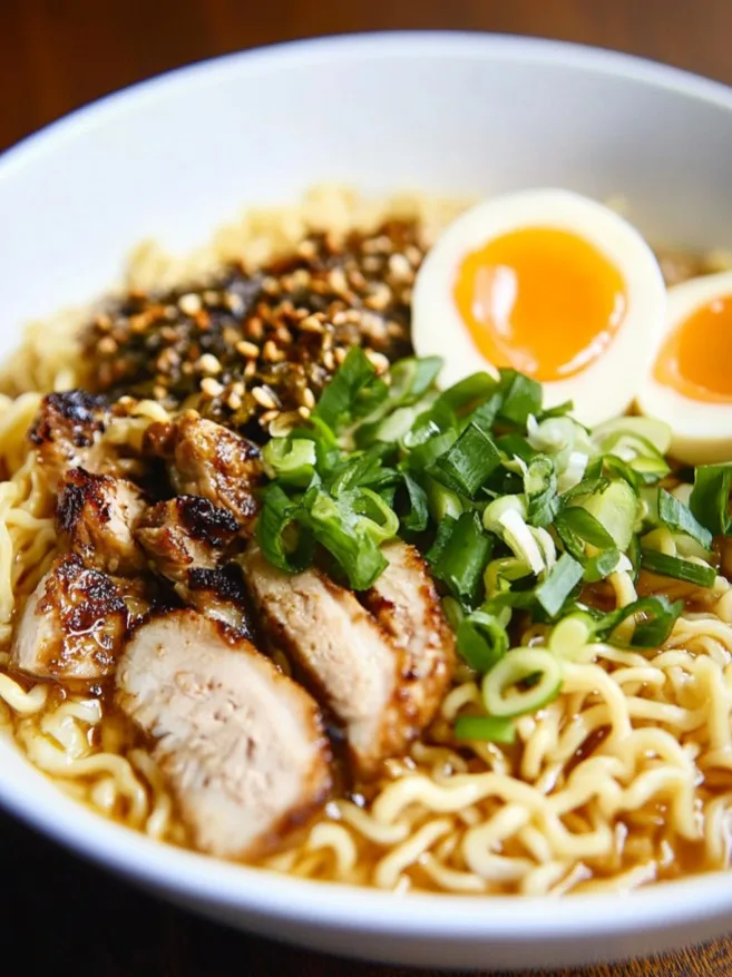 Top each bowl with a halved soft-boiled egg, a generous sprinkle of sliced green onions, and a dash of sesame seeds. Serve immediately while hot!