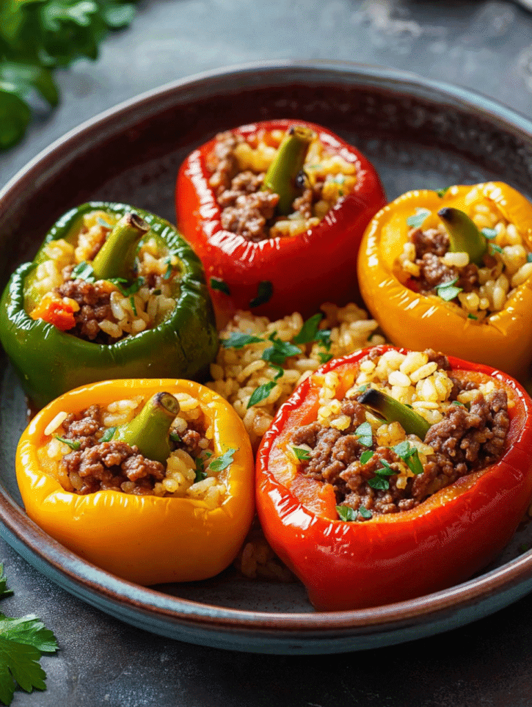 Stuffed bell peppers are a staple for easy weeknight dinners. This beef and rice version is hearty, packed with flavor, and offers everything you need in a single, delicious package.