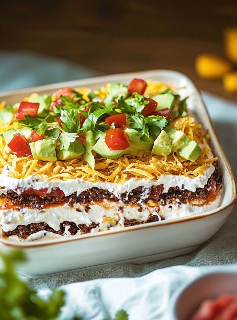 When a quick crowd-pleaser is what you need, this 7-Layer Dip steps up. It’s a staple at gatherings with a simple assembly that offers vibrant flavors in every scoop. Each layer contributes to a rich and satisfying bite, perfect for sharing.